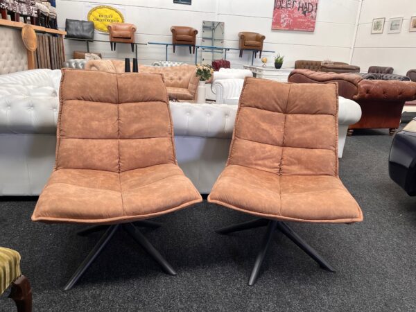 Op zoek naar stijlvolle en comfortabele fauteuils? Wij bieden twee moderne draaifauteuils aan, uitgevoerd in luxe microleder in een warme cognac kleur met een stoere grijs-antraciet metalen draaivoet.