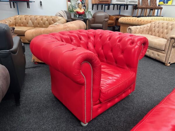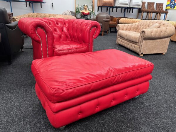 Prachtige Chesterfield fauteuil (type Brighton) van hoogwaardig rood rundleer. Ambachtelijk afgewerkt met siernagels. Inclusief bijpassende rundleren hocker/voetenbank.