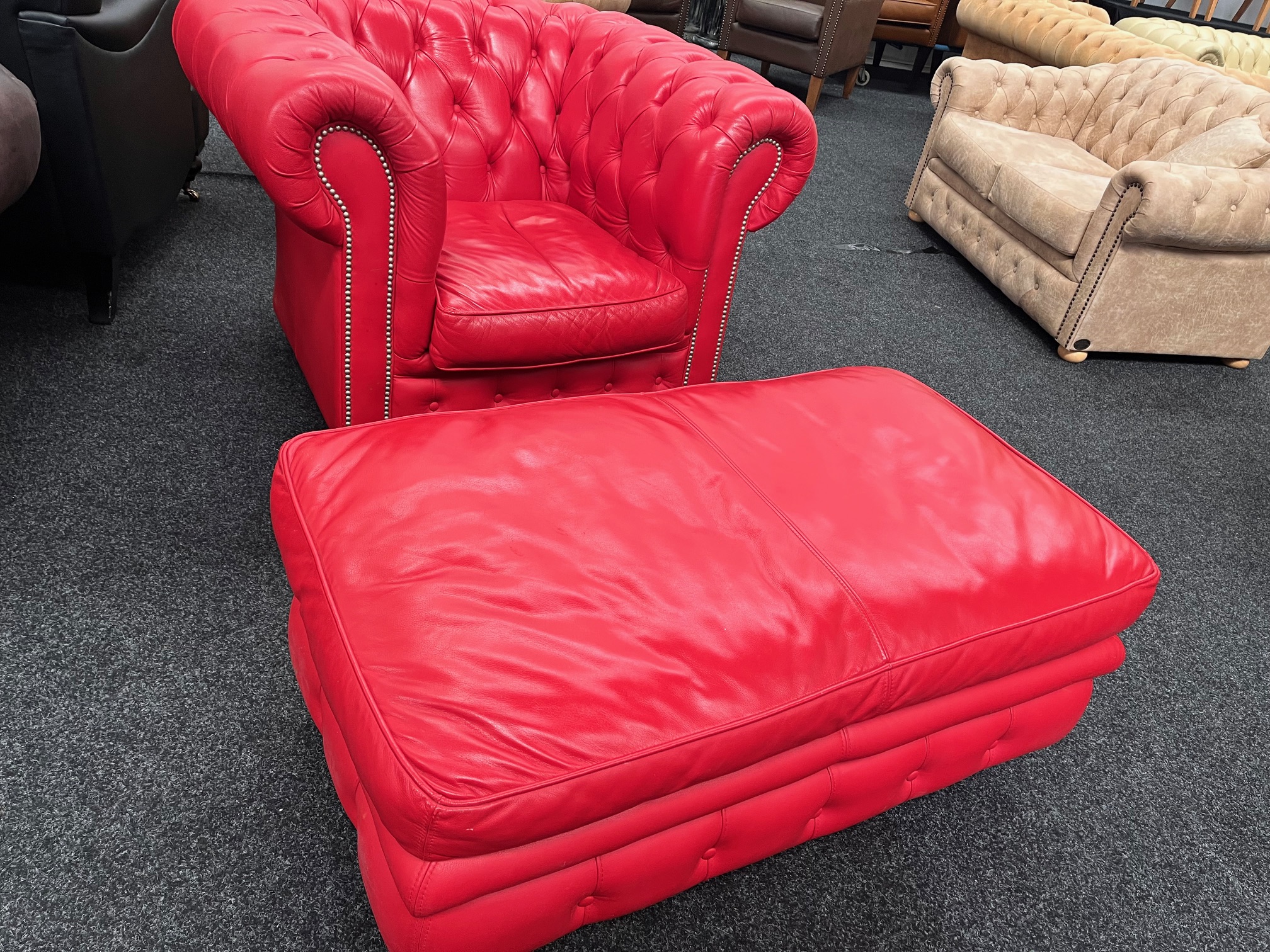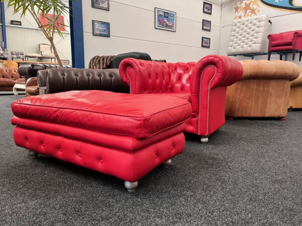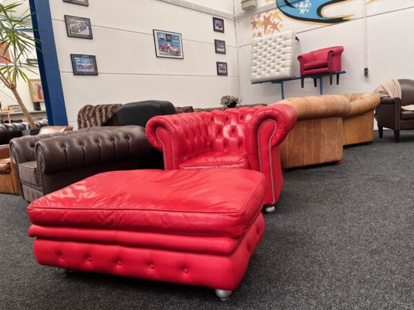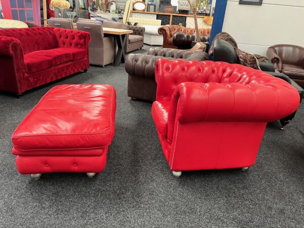 Te koop: Rood rundleren Chesterfield fauteuil met hocker