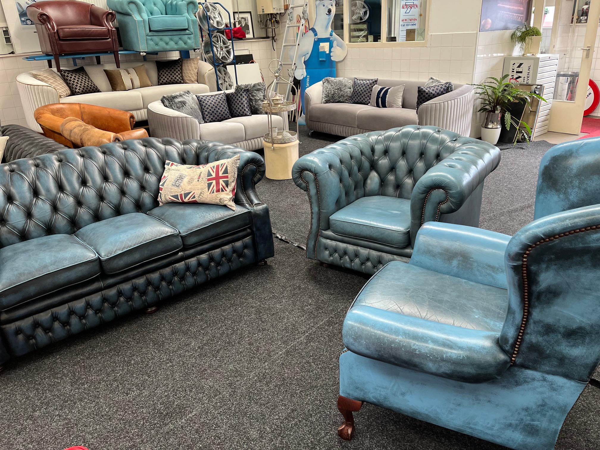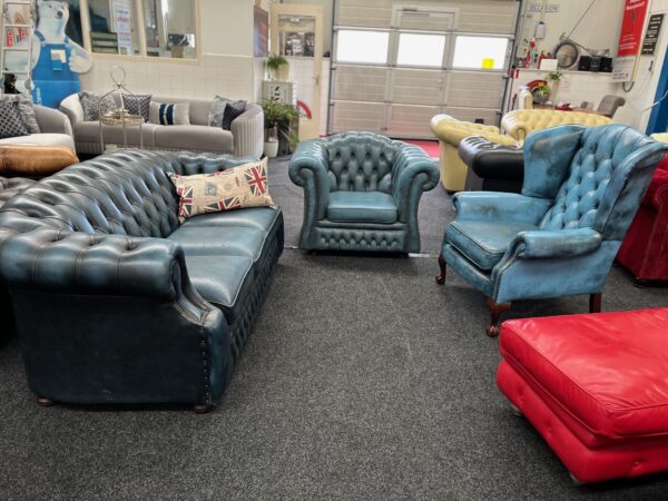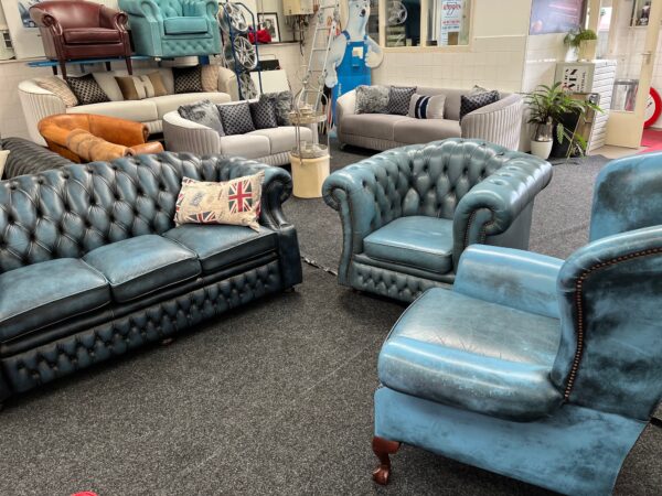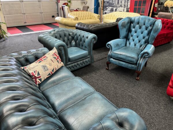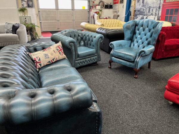 Prachtige Springvale Chesterfield fauteuil in stijlvol blauw leer. Deze Set heeft een fraaie patina die de vintage uitstraling extra karakter geeft.