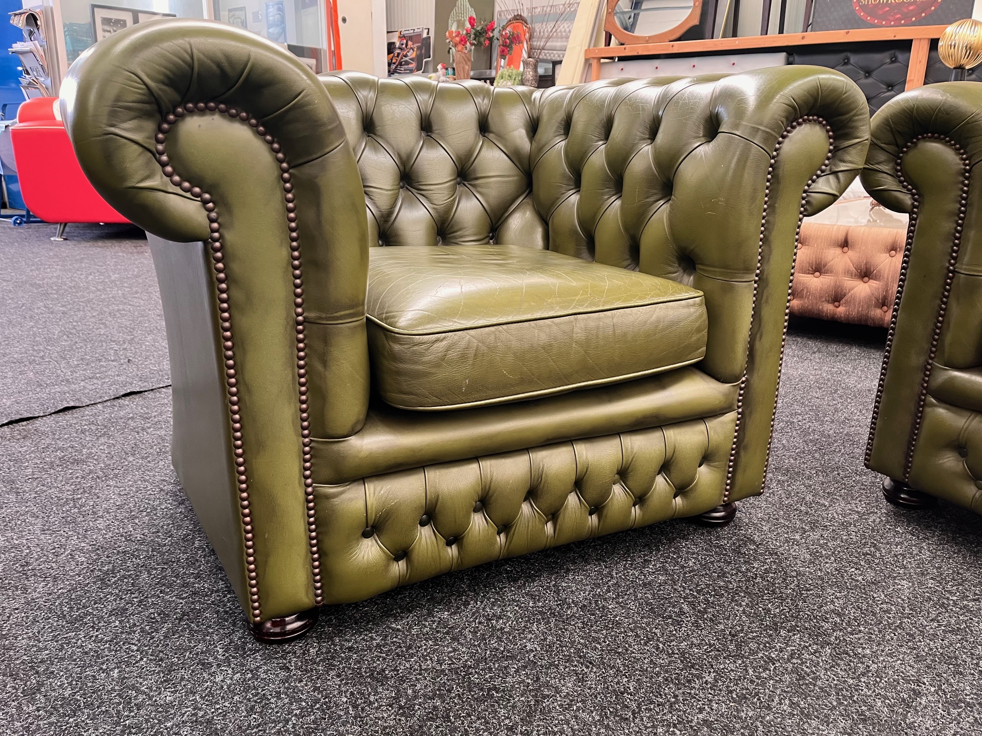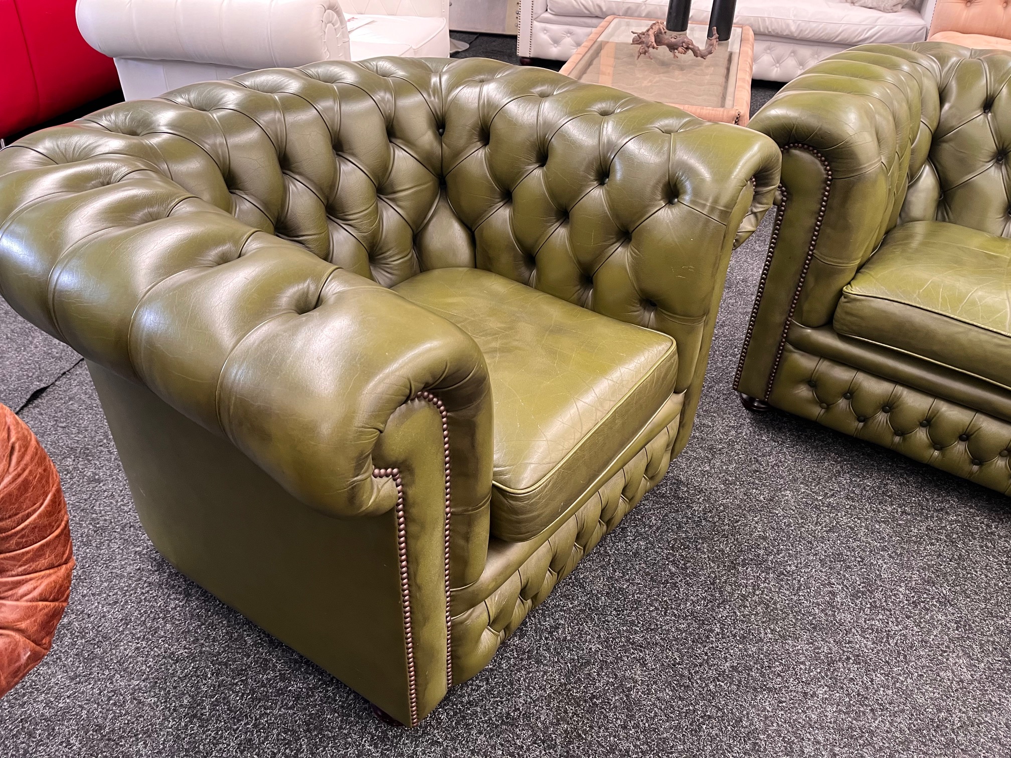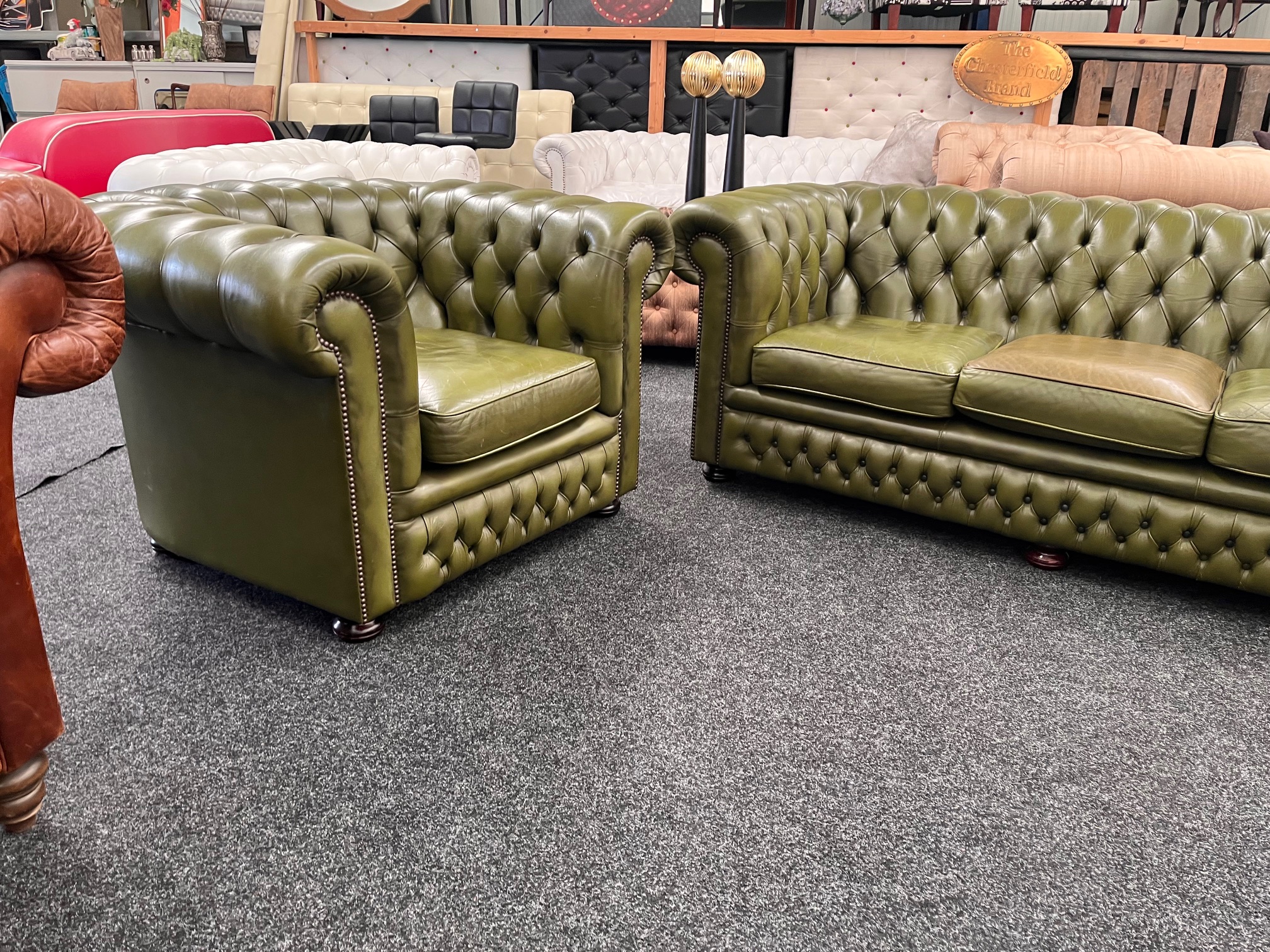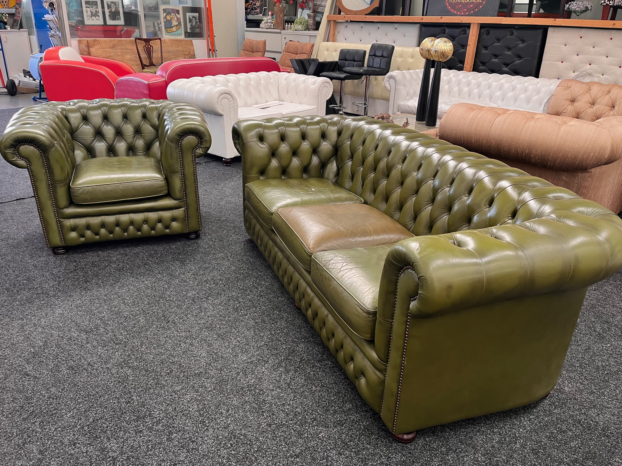 Te koop: Prachtige vintage 3-zits Chesterfield bank met bijpassende fauteuil – Groen rundleer