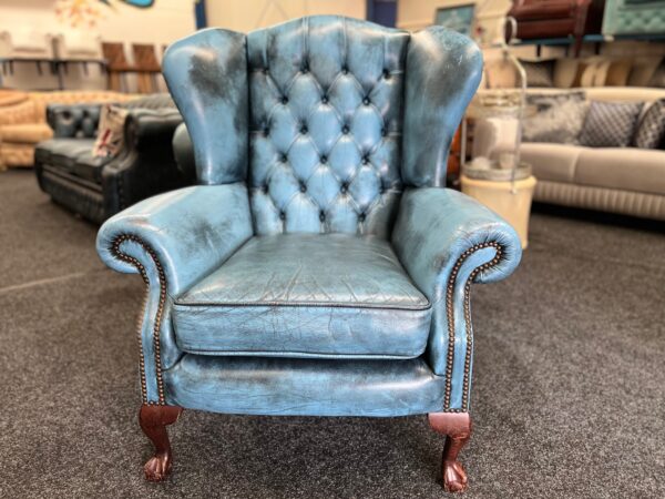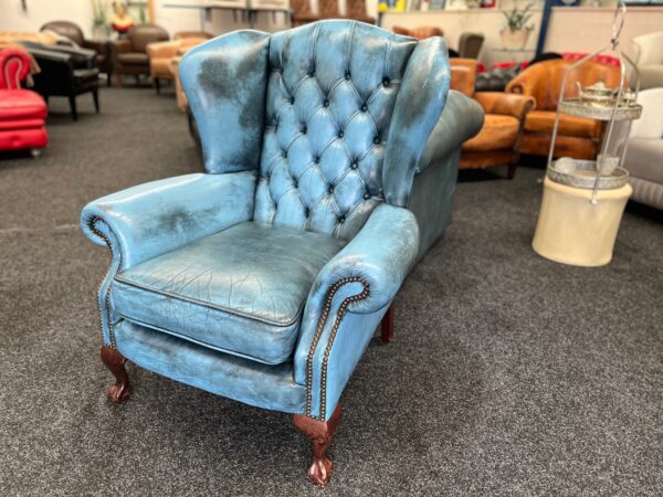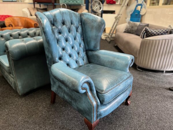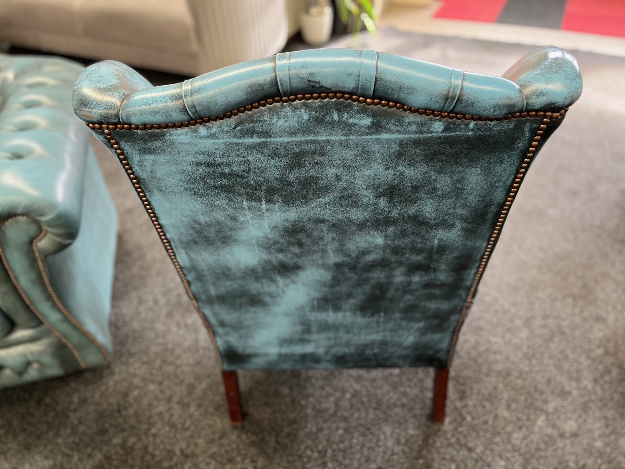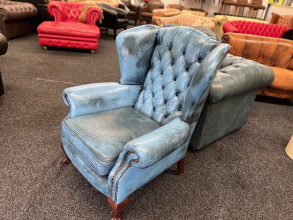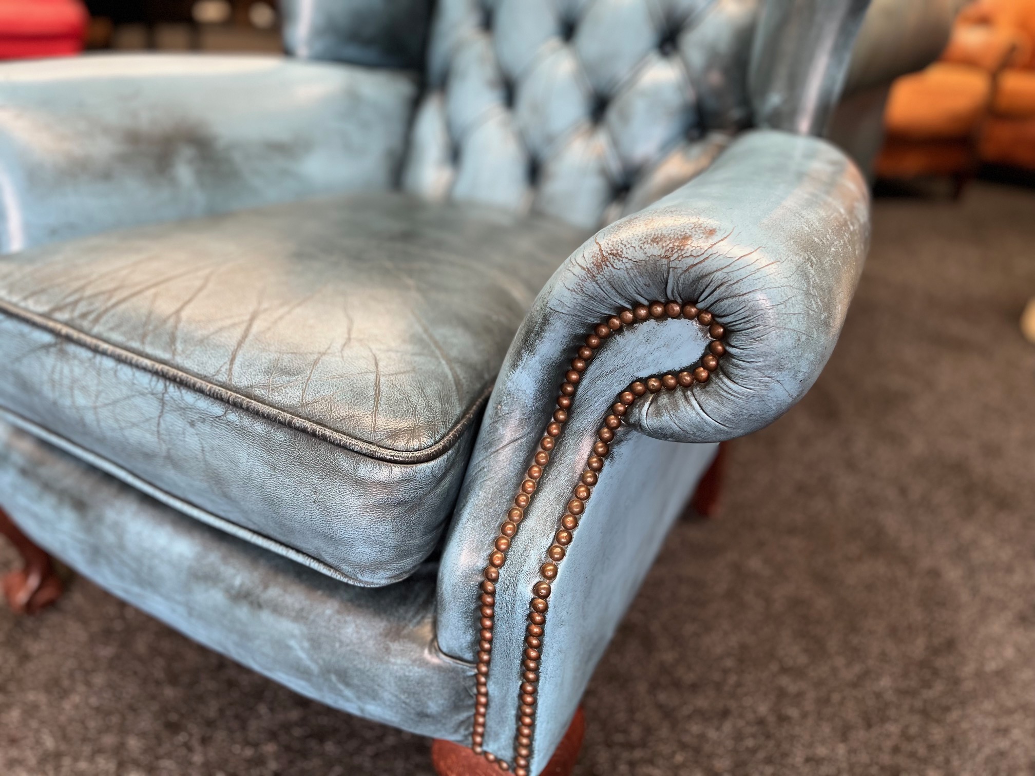 Prachtige Springvale Chesterfield fauteuil in stijlvol blauw leer. Dit meubel heeft een fraaie patina die de vintage uitstraling extra karakter geeft. De fauteuil is klassiek afgewerkt met metalen nagels en biedt een uitstekend zitcomfort – zoals u van een echte Chesterfield mag verwachten.