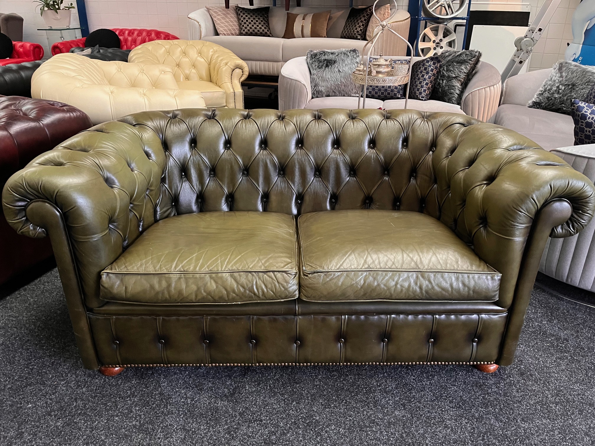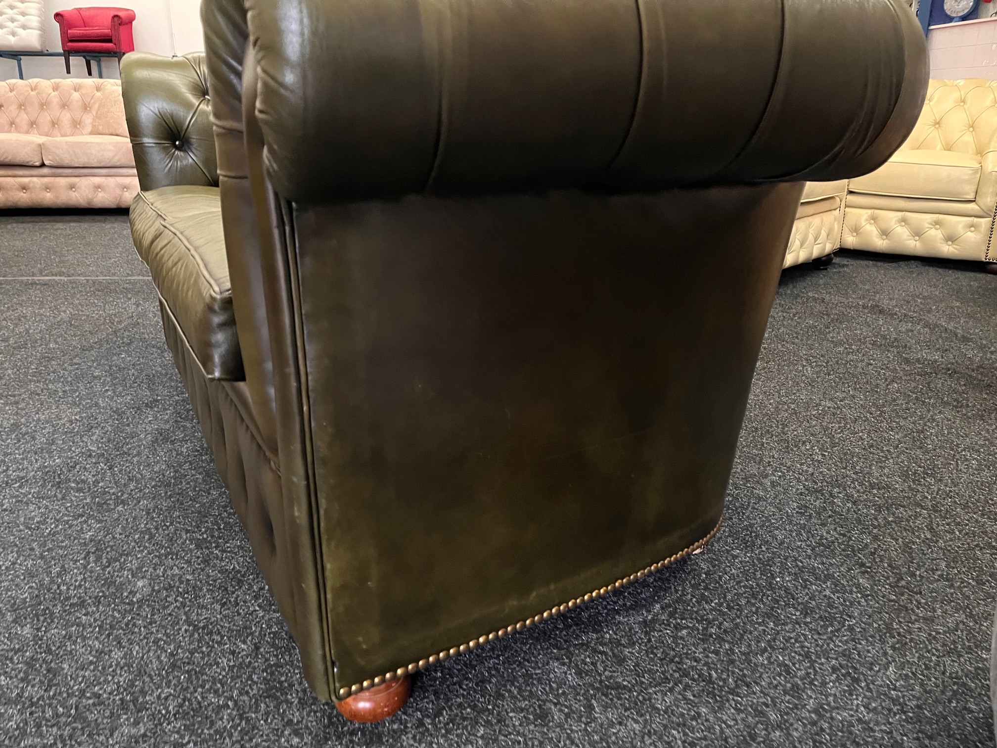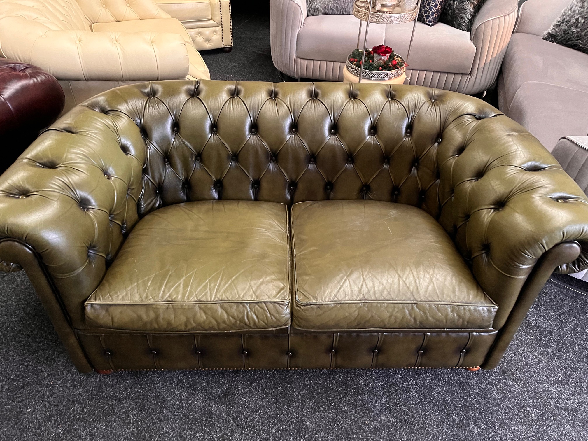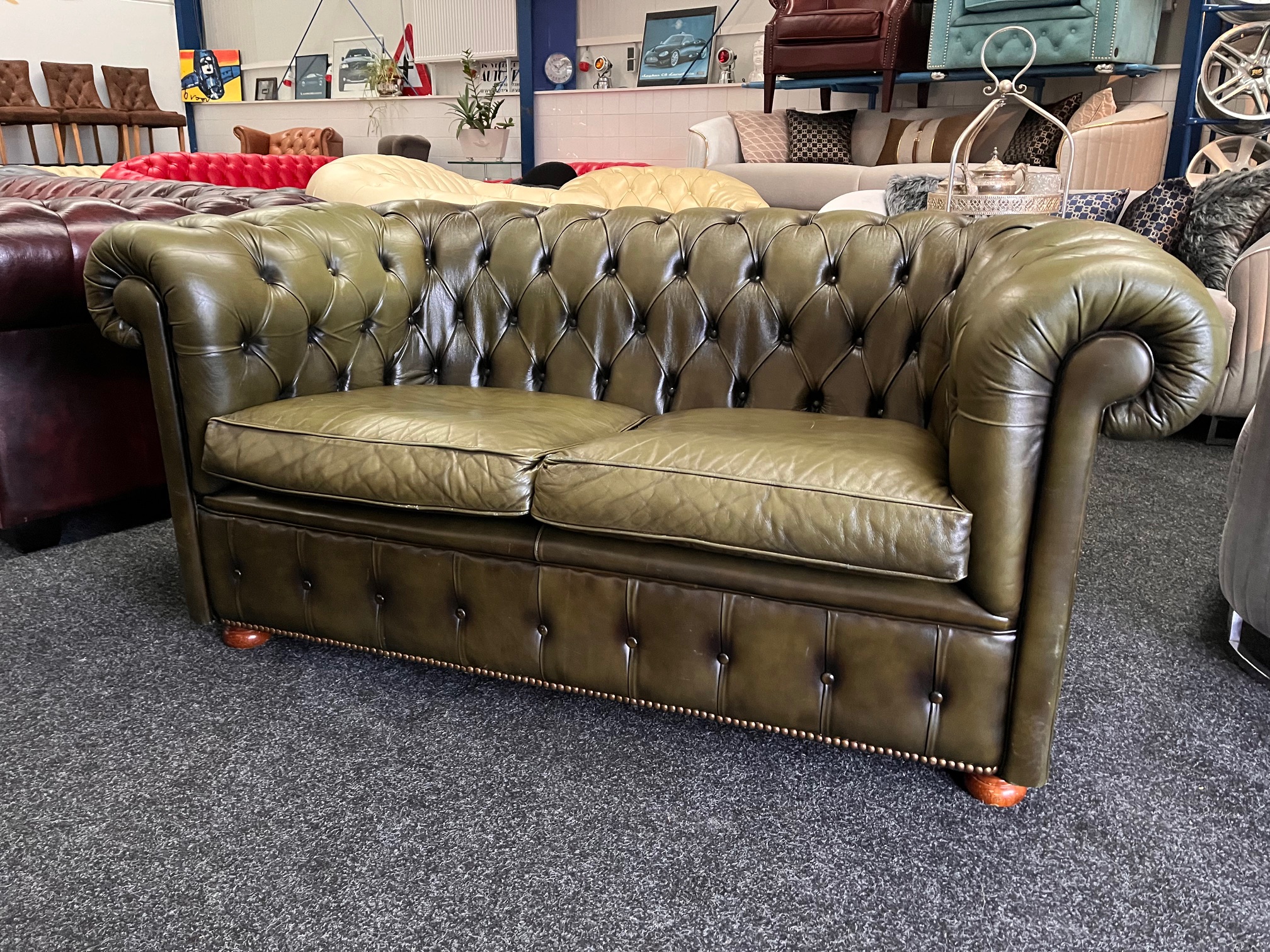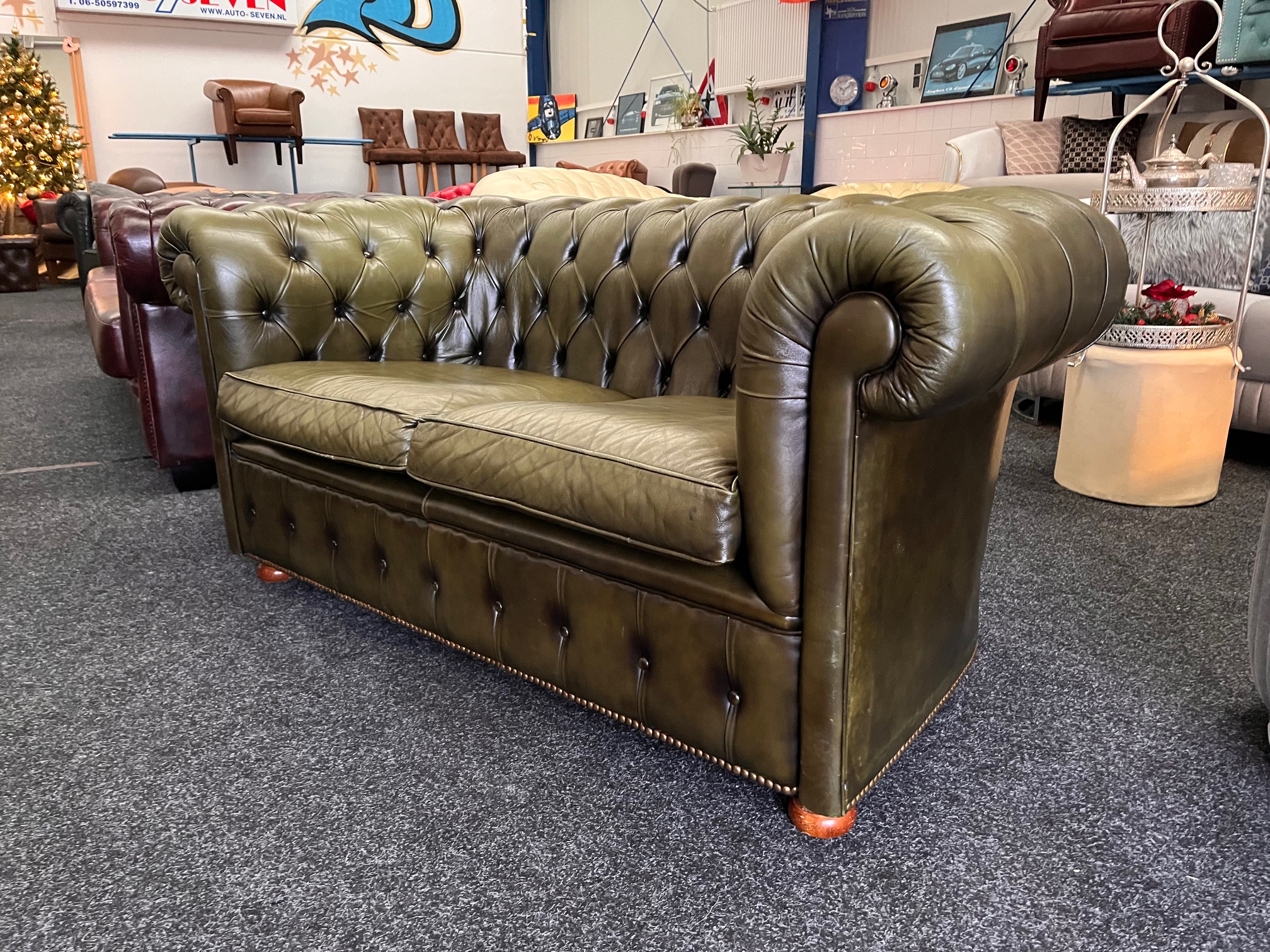 VERKOCHT  Originele vintage 2-zits Chesterfield bank – Groen Rund leer